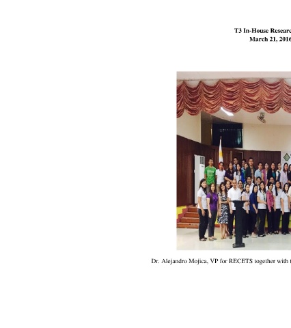 T3 In-House Research and Development Review March 21, 2016, CvSU Main Campus Dr. Alejandro Mojica, VP for RECETS together with the T3 campus dean, Prof. Cristina M. Signo, faculty and staff