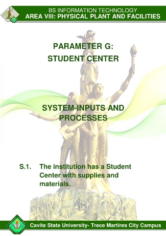BS INFORMATION TECHNOLOGY AREA VIII: PHYSICAL PLANT AND FACILITIES PARAMETER G: STUDENT CENTER SYSTEM-INPUTS AND PROCESSES S.1. The institution has a Student Center with supplies and materials. Cavite State University- Trece Martires City Campus