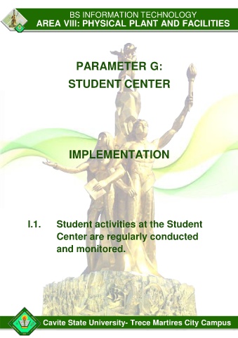 BS INFORMATION TECHNOLOGY AREA VIII: PHYSICAL PLANT AND FACILITIES PARAMETER G: STUDENT CENTER IMPLEMENTATION I.1. Student activities at the Student Center are regularly conducted and monitored. Cavite State University- Trece Martires City Campus