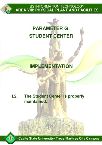 BS INFORMATION TECHNOLOGY AREA VIII: PHYSICAL PLANT AND FACILITIES PARAMETER G: STUDENT CENTER IMPLEMENTATION I.2. The Student Center is properly maintained. Cavite State University- Trece Martires City Campus