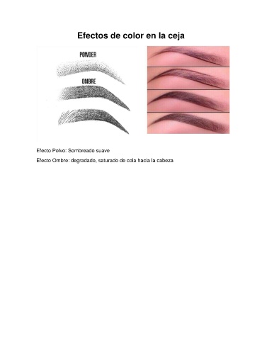 Efectos de color en la ceja Efecto Polvo: Sombreado suave Efecto Ombre: degradado, saturado de cola hacia la cabeza