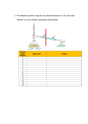 3. Perhatikanlah gambar rangkaian alat destilasi dibawah ini, lalu isilah tabel