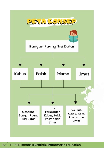 PETA KONSEP PETA KONSEP Bangun Ruang Sisi Datar Kubus Balok Prisma Limas Luas Mengenal Permukaan Volume Bangun Ruang Kubus, Balok, Kubus, Balok, Prisma dan Sisi Datar Prisma dan Limas Limas iv E-LKPD Berbasis Realistic Mathematic Education