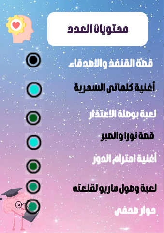 محتويات العدد قصة القنفذ والاصدقاء أغنية كلماتى السحرية لعبة بوصلة الاعتذار قصة نورا والصبر أغنية احترام الدور لعبة وصول ماريو لقلعته حوار صحفى