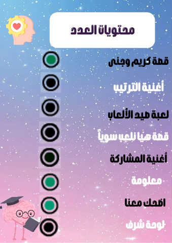 محتويات العدد قصة كريم وجنى أغنية الترتيب لعبة صيد الألعاب قصة هيا نلعب سويًا أغنية المشاركة معلومة اضحك معنا لوحة شرف