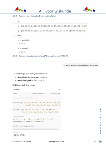 A.I. voor wiskunde 4.7.2 Controle met het rekenblad van GeoGebra 4.7.3 Correcte berekeningen ChatGPT na analyse met PYTHON De bijhorende Python code: t e n . o l e h t a m . w w w © 2025 Ivan De Winne ivan@mathelo.net 37