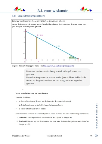 Bepaal de lengte van de kortste ladder (uitschuifbare ladder !) die steunt op de grond en de muur