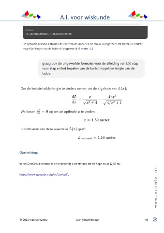 A.I. voor wiskunde Opmerking: In het GeoGebra bestand is de onbekende x de afstand tot de hoge muur (2,59 m) t e https://www.geogebra.org/m/uqwjpdfc n . o l e h t a m . w w w © 2025 Ivan De Winne ivan@mathelo.net 46
