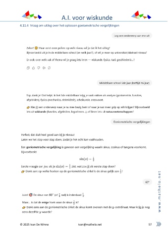 A.I. voor wiskunde 4.11.4 Vraag om uitleg over het oplossen goniometrische vergelijkingen t e n . o l e h t a m . w w w © 2025 Ivan De Winne ivan@mathelo.net 57