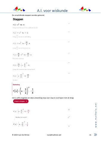 A.I. voor wiskunde De verschillende stappen worden getoond. Het is zelfs mogelijk om deze uitwerking stap voor stap te overlopen met de knop t e n . o l e h t a m . w w w © 2025 Ivan De Winne ivan@mathelo.net 11