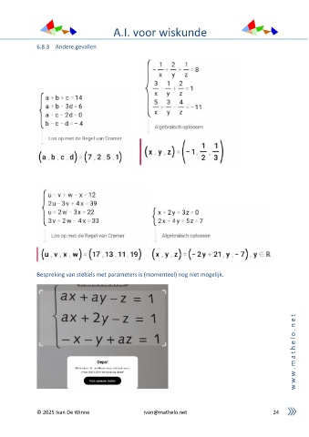 A.I. voor wiskunde 6.8.3 Andere gevallen Bespreking van stelsels met parameters is (momenteel) nog niet mogelijk. t e n . o l e h t a m . w w w © 2025 Ivan De Winne ivan@mathelo.net 24