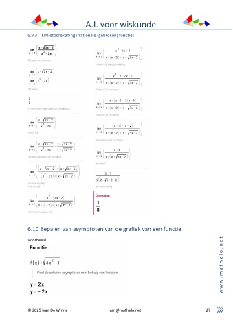 A.I. voor wiskunde 6.9.3 Limietberekening irrationale (gebroken) functies 6.10 Bepalen van asymptoten van de grafiek van een functie t Voorbeeld e n . o l e h t a m . w w w © 2025 Ivan De Winne ivan@mathelo.net 27