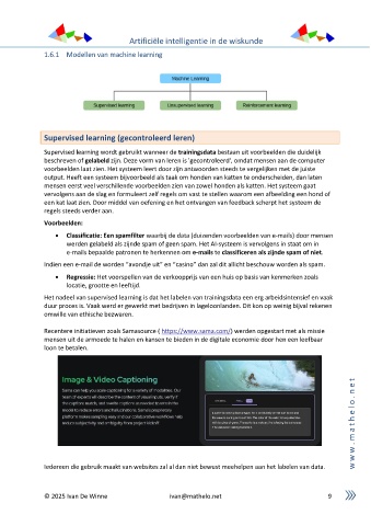 • Classificatie: Een spamfilter waarbij de data (duizenden voorbeelden van e-mails) door mensen