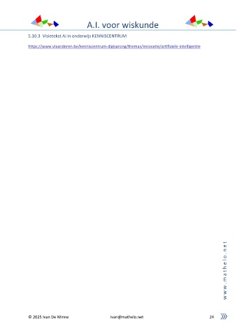 A.I. voor wiskunde 5.10.3 Visietekst Ai in onderwijs KENNISCENTRUM https://www.vlaanderen.be/kenniscentrum-digisprong/themas/innovatie/artificiele-intelligentie t e n . o l e h t a m . w w w © 2025 Ivan De Winne ivan@mathelo.net 24