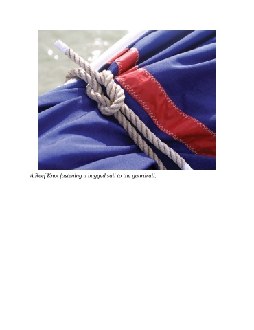 A Reef Knot fastening a bagged sail to the guardrail.