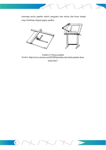 terpasang mesin gambar seperti penggaris atau mistar dan busur derajat yang terhubung dengan papan gambar. Gambar 8. Papan gambar (Sumber: https://www.omesin.com/2018/05/peralatan-dan-bahan-gambar-dasar- teknik.html ) 9