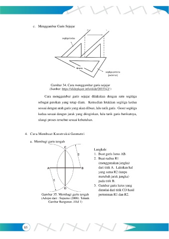 Cara menggambar garis sejajar dilakukan dengan satu segitiga