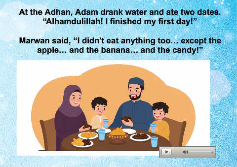 At the Adhan, Adam drank water and ate two dates. “Alhamdulillah! I finished my first day!” Marwan said, “I didn’t eat anything too… except the apple… and the banana… and the candy!”
