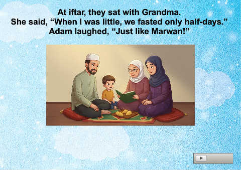 At iftar, they sat with Grandma. She said, “When I was little, we fasted only half-days.” Adam laughed, “Just like Marwan!”