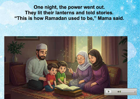 One night, the power went out. They lit their lanterns and told stories. “This is how Ramadan used to be,” Mama said.