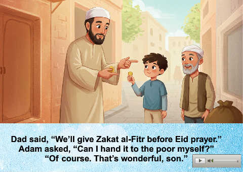 Dad said, “We’ll give Zakat al-Fitr before Eid prayer.” Adam asked, “Can I hand it to the poor myself?” “Of course. That’s wonderful, son.”