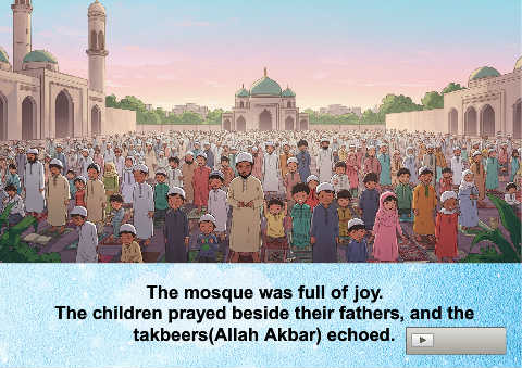 The mosque was full of joy. The children prayed beside their fathers, and the takbeers(Allah Akbar) echoed.