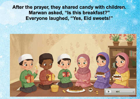 After the prayer, they shared candy with children. Marwan asked, “Is this breakfast?” Everyone laughed, “Yes, Eid sweets!”