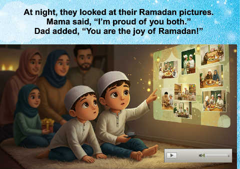 At night, they looked at their Ramadan pictures. Mama said, “I’m proud of you both.” Dad added, “You are the joy of Ramadan!”