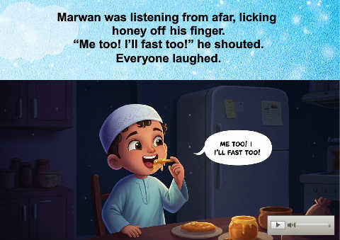 Marwan was listening from afar, licking honey off his finger. “Me too! I’ll fast too!” he shouted. Everyone laughed.