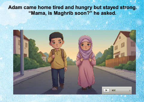 Adam came home tired and hungry but stayed strong. “Mama, is Maghrib soon?” he asked.