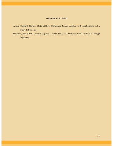 DAFTAR PUSTAKA Anton. Howard, Rorres. Chris. (2005). Elementary Linear Algebra with Applications. John Wiley & Sons, Inc Hefferon, Jim (2006). Linear Algebra. United States of America: Saint Michael’s College Colchester. 21