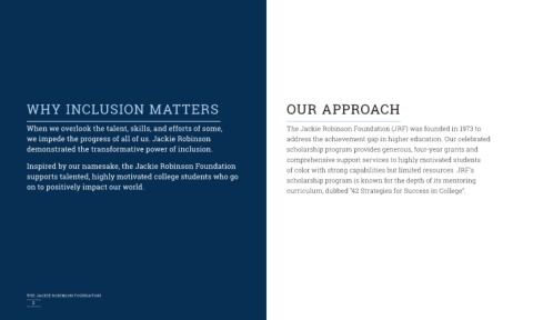 Inspired by our namesake, the Jackie Robinson Foundation of color with strong capabilities but limited resources. JRF’s