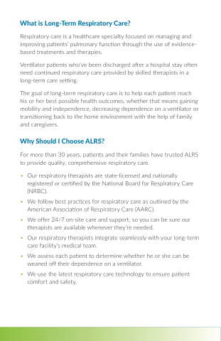 For more than 30 years patients and their families have trusted ALRS to to provide quality comprehensive respiratory care • Ourrespiratorytherapistsarestate-licensedandnationally registered or or or certified by the National Board for Respiratory Care (NRBC) • Wefollowbestpracticesforrespiratorycareasoutlinedbythe American Association of Respiratory Care (AARC) • Weoffer24/7on-sitecareandsupport soyoucanbesureour therapists are available whenever they’re needed • Ourrespiratorytherapistsintegrateseamlesslywithyourlong-term care facility’s medical team • Weassesseachpatienttodeterminewhetherheorshecanbe weaned off their dependence on a a a ventilator • Weusethelatestrespiratorycaretechnologytoensurepatient comfort and safety