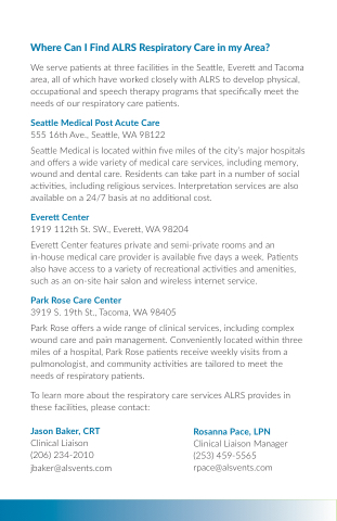 We serve patients a at a three facilities in the Seattle Everett and Tacoma area all of which have worked closely with ALRS to develop physical occupational and speech therapy programs that specifically meet the the needs of our respiratory care patients Seattle Seattle Medical Post Acute Care 555 16th Ave Seattle Seattle WA 98122