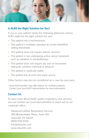 * Some ALRS facilities may offer dialysis for ventilator patients. Contact your local ALRS representative for more information.