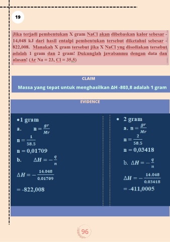 19 CLAIM Massa yang tepat untuk menghasilkan ∆H -803,8 adalah 1 gram EVIDENCE 96