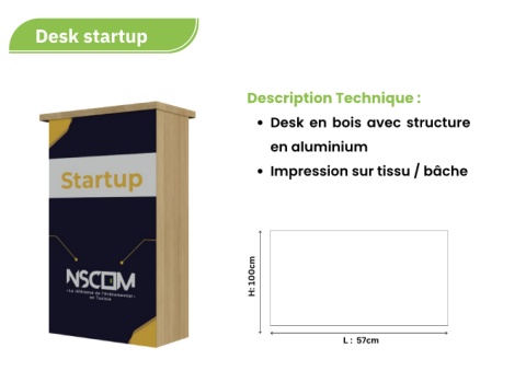 Desk startup Description Technique : Desk en bois avec structure en aluminium Impression sur tissu / bâche H: 100cm L : 57cm