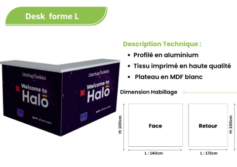 Desk forme L Description Technique : Profilé en aluminium Tissu imprimé en haute qualité Plateau en MDF blanc Dimension Habillage H: 100cm Face Retour H: 100cm L : 140cm L : 172cm