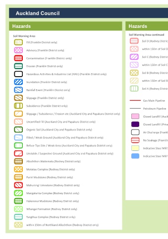 Auckland Council Hazards Soil Warning Area Fill (Franklin District only) Advisory (Franklin District only) Contamination (Franklin District only) Erosion (Franklin District only) Hazardous Activities & Industries List (HAIL) (Franklin District only) Inundation (Franklin District only) Rainfall Event (Franklin District only) Slippage (Franklin District only) Subsidence (Franklin District only) Slippage / Subsidence / Erosion etc (Auckland City and Papakur
