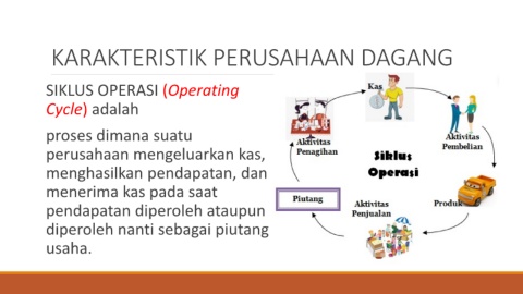 KARAKTERISTIK PERUSAHAAN DAGANG SIKLUS OPERASI (Operating Cycle) adalah proses dimana suatu perusahaan mengeluarkan kas, menghasilkan pendapatan, dan menerima kas pada saat pendapatan diperoleh ataupun diperoleh nanti sebagai piutang usaha.