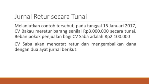 CV Bakau meretur barang senilai Rp3.000.000 secara tunai.