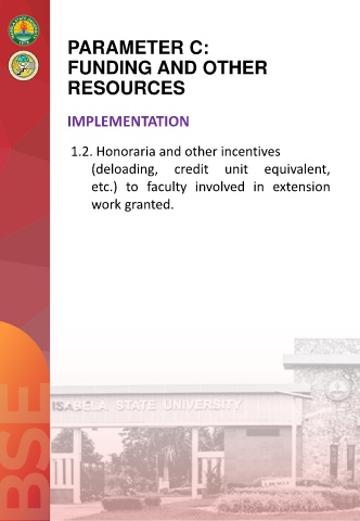 PARAMETER C: FUNDING AND OTHER RESOURCES IMPLEMENTATION 1.2. Honoraria and other incentives (deloading, credit unit equivalent, etc.) to faculty involved in extension work granted.