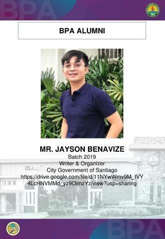 BPA ALUMNI MR. JAYSON BENAVIZE Batch 2019 Writer & Organizer City Government of Santiago https://drive.google.com/file/d/11NYwWmv9M_fVY 4LcHNVMMd_yz9OimzYz/view?usp=sharing