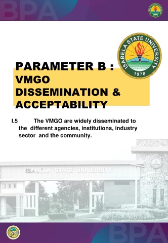 PARAMETER B : VMGO DISSEMINATION & ACCEPTABILITY I.5 The VMGO are widely disseminated to the different agencies, institutions, industry sector and the community.