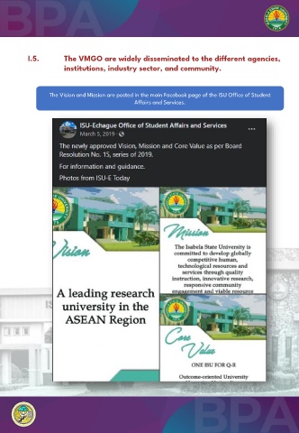 I.5. The VMGO are widely disseminated to the different agencies, institutions, industry sector, and community. The Vision and Mission are posted in the main Facebook page of the ISU Office of Student Affairs and Services.