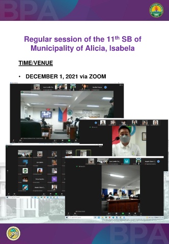 Regular session of the 11 SB of th Municipality of Alicia, Isabela TIME/VENUE • DECEMBER 1, 2021 via ZOOM