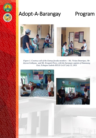 Adopt-A-Barangay Program Figure 1. Courtesy call of the Entrep faculty members – Ms. Vivian Dumrique, Mr. Jayson Gollayan, and Mr. Exequiel Perez, with the barangay captain of Dammang East, Echague Isabela HELD LAST July 22, 2021