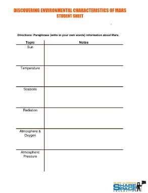 DISCOVERING ENVIRONMENTAL CHARACTERISTICS OF MARS STUDENT SHEET Directions: Paraphrase (write in your own words) information about Mars. Topic Notes Sun Temperature Seasons Radiation Atmosphere & Oxygen Atmospheric Pressure