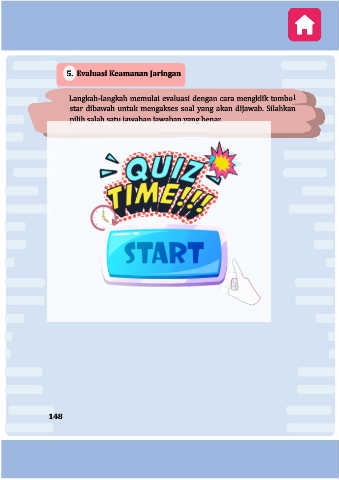 5. Evaluasi Keamanan Jaringan Langkah-langkah memulai evaluasi dengan cara mengklik tombol star dibawah untuk mengakses soal yang akan dijawab. Silahkan pilih salah satu jawaban jawaban yang benar. 148
