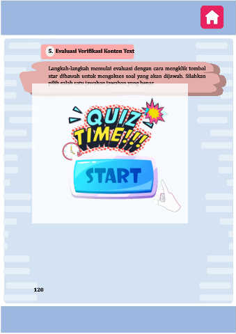 5. Evaluasi Verifikasi Konten Text Langkah-langkah memulai evaluasi dengan cara mengklik tombol star dibawah untuk mengakses soal yang akan dijawab. Silahkan pilih salah satu jawaban jawaban yang benar. 120